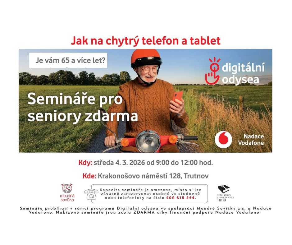 Je Vám 65 a více let, máte svůj chytrý telefon nebo tablet a chcete se zdokonalit v jeho používání? Obsah semináře bude přizpůsoben úrovni Vašich znalostí a Vašim potřebám, je vhodný zejména pro mírně pokročilé uživatele. Na semináři budete pracovat na svém vlastním zařízení, které si přinesete s sebou dostatečně nabité. Semináře probíhají v rámci programu Digitální odysea ve spolupráci Moudré Sovičky z.s. a Nadace Vodafone a jsou zcela zdarma díky finanční podpoře Nadace Vodafone.