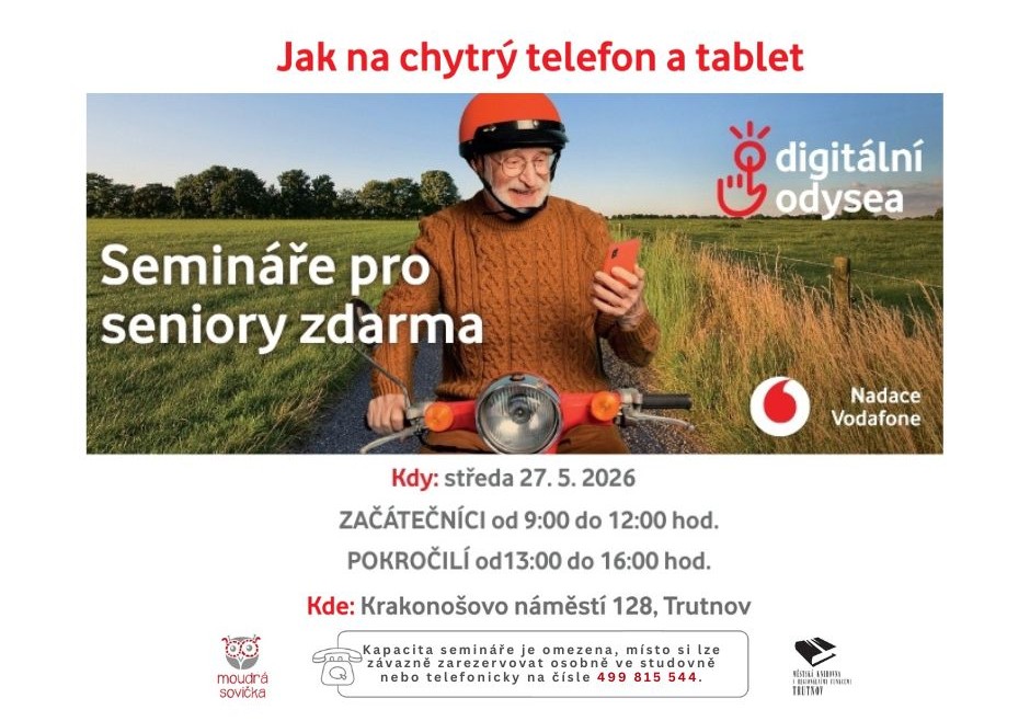 Městská knihovna v Trutnově ve spolupráci s neziskovou organizací Moudrá Sovička z. s. a Nadací Vodafone pořádají ZDARMA semináře „Jak na chytrý telefon a tablet“. Semináře jsou určeny seniorům ve věku 65+ a zaměřují se na praktické ovládání chytrých telefonů a tabletů i bezpečný pohyb na internetu. Účastníci si osvojí základní i pokročilejší dovednosti v přátelské a srozumitelné formě. Pro účast na seminářích je nutné závazné přihlášení. Rezervace míst je možná telefonicky na čísle 499 815 544 nebo osobně ve studovně.