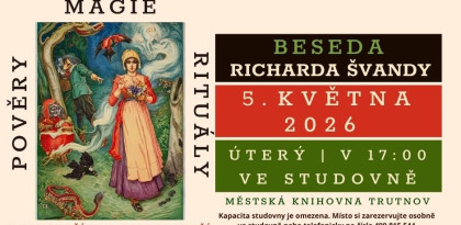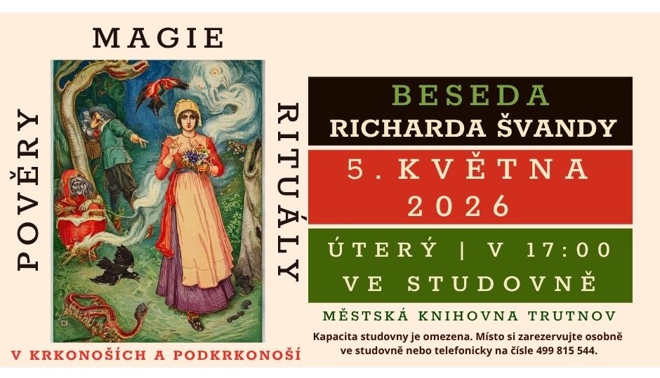 Pan Švanda přenese posluchače do tajemného světa lidových představ, dávných zvyků a nadpřirozených sil, které po staletí utvářely život v tomto horském regionu. Dozvíte se o víře v čarodějnice, setkáte se s rozmanitými nadpřirozenými bytostmi a nahlédnete do tradic spojených s ochranou před zlými silami. Součástí povídání budou také příběhy o zázračných léčivých prostředcích, magických rituálech i každodenních praktikách našich předků. Beseda nabídne nejen poutavé vyprávění, ale i hlubší porozumění kulturnímu dědictví Krkonoš a Podkrkonoší. Kapacita studovny je omezena, místo lze zarezervovat osobně ve studovně nebo telefonicky na čísle 499 815 544.